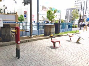 園内は狭く、トイレと端の方にスモーキングエリアがあるため、目の前にあるバス停のバス待ちの方など大人の方の利用が多く、遊具もどちらかというと、健康遊具が多い印象です。