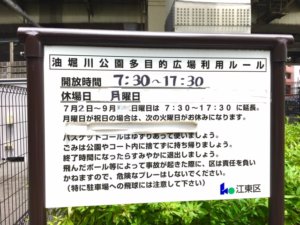 【油堀川公園多目的広場】高架下で雨の日でも遊べるバスケットゴールのある門前仲町一丁目の公園