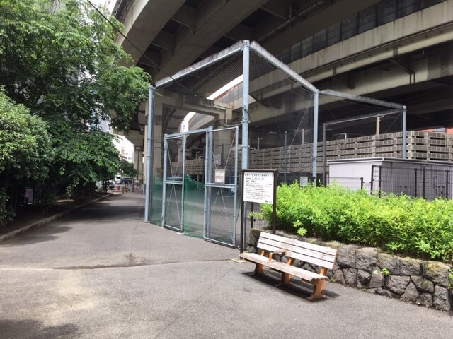 【油堀川公園多目的広場】高架下で雨の日でも遊べるバスケットゴールのある門前仲町一丁目の公園