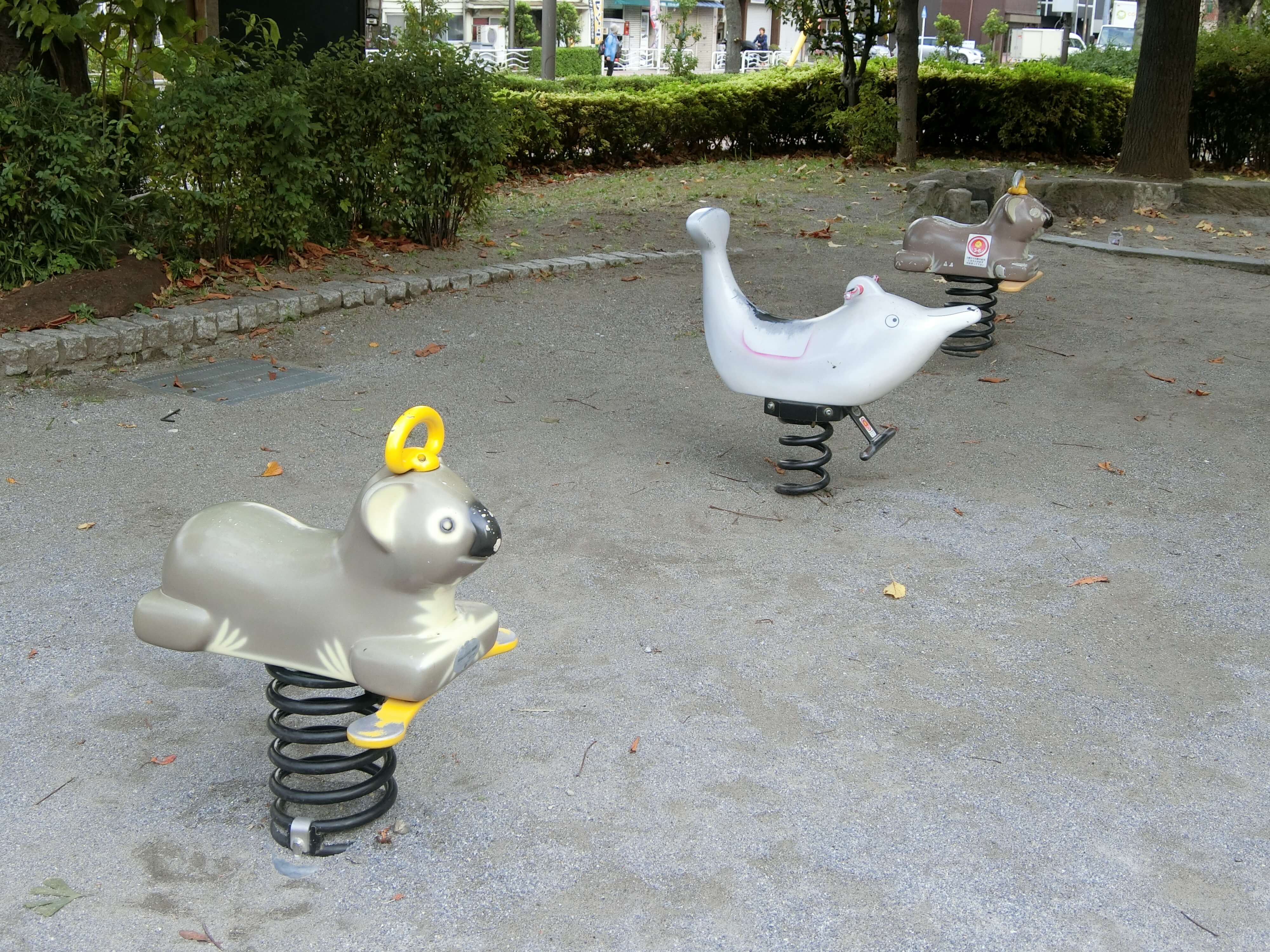 小さなお子さん向けのスプリング遊具は、中央のイルカの両脇をなぜかコアラが固めています。。
