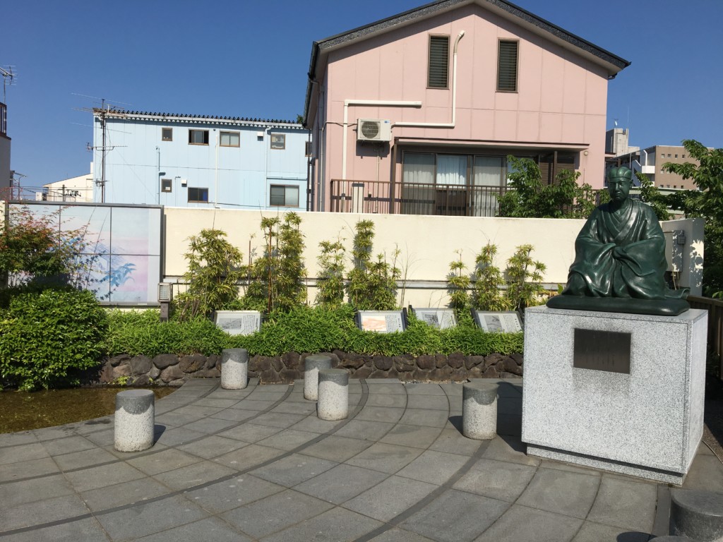 入り口の階段を上ると隅田川が一望できて、庭園内には松尾芭蕉の座像があります。