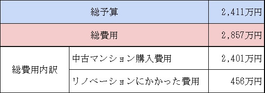 費用の内訳を見ると、中古マンションの購入費用が2,401万円、リノベーションにかかった費用が456万円となっており、中古マンションの購入費用だけで当初予算を消化してしまっていることが分かります(下表参照)。