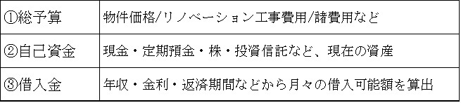 資金計画は「①総予算=②自己資金+③借入金」という考え方に基づいて、物件価格・工事費用・年収・借入額のバランスを取ることがポイントとなります。