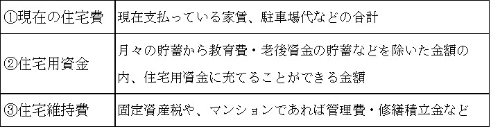 月々の返済可能額は、①現在の住宅費(年)に②住宅用資金(年)を加え、そこから③住宅維持費(管理費・固定資産税など)を差し引いた額がおおよそとなります。