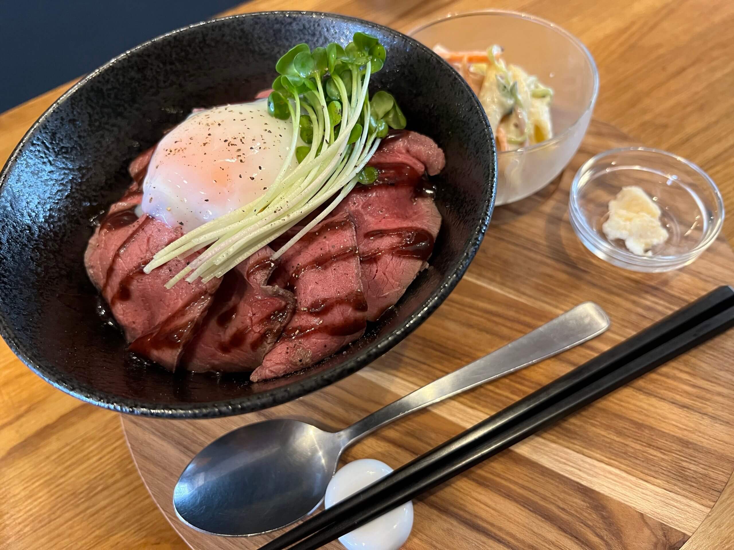 ランチでお伺いしたので、定番のローストビーフ丼とプリンを頂きました。