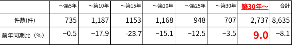 ほとんどの築年帯で前年同期比マイナスとなっていますが、築30年以上だけ前年比プラスとなっています。