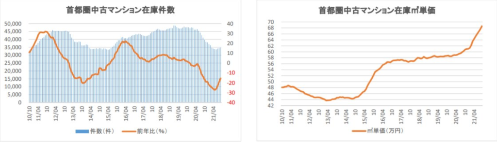 以下のグラフは、それぞれ2010年以降の「首都圏中古マンション在庫件数(グラフ左)」と「首都圏中古マンション在庫㎡単価(グラフ右)」の推移をまとめたものです。