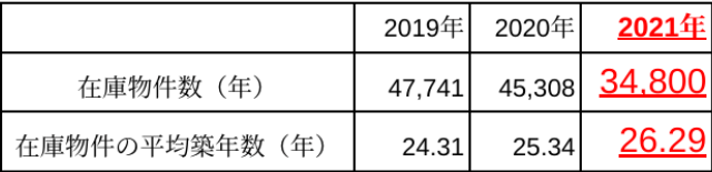 次に、直近3年間の在庫物件数とその平均築年数の推移を見てみましょう。