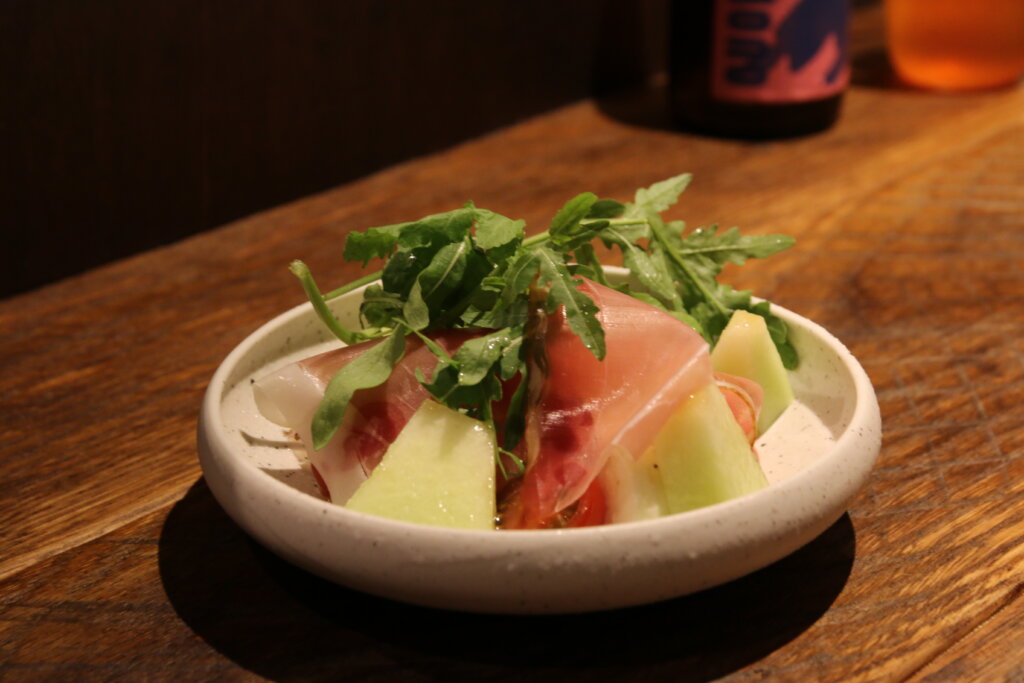 カプレーゼで使用されているメロンはこだわりの北海道・有珠郡にあるご友人のお父様が生産されているもの。甘いのはもちろん、とっても香りがよくてジューシー!そこにスモーキーな生ハムと濃厚なチーズの組み合わせはもう最高です…。