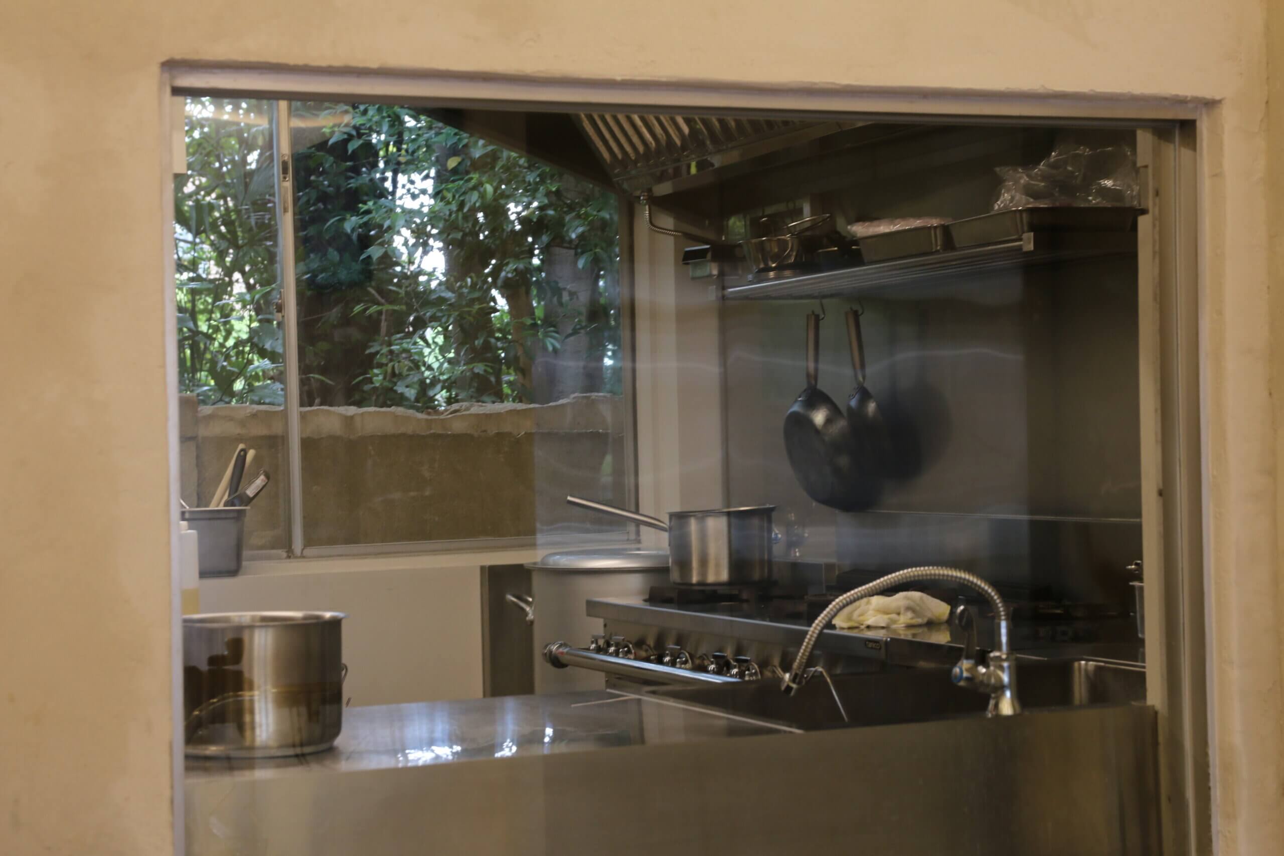 カウンターの奥にはキッチンと清澄庭園の緑が見えて癒されますね。塗壁やシルバーの扉、木のカウンターと素材感ある内装がとても素敵!