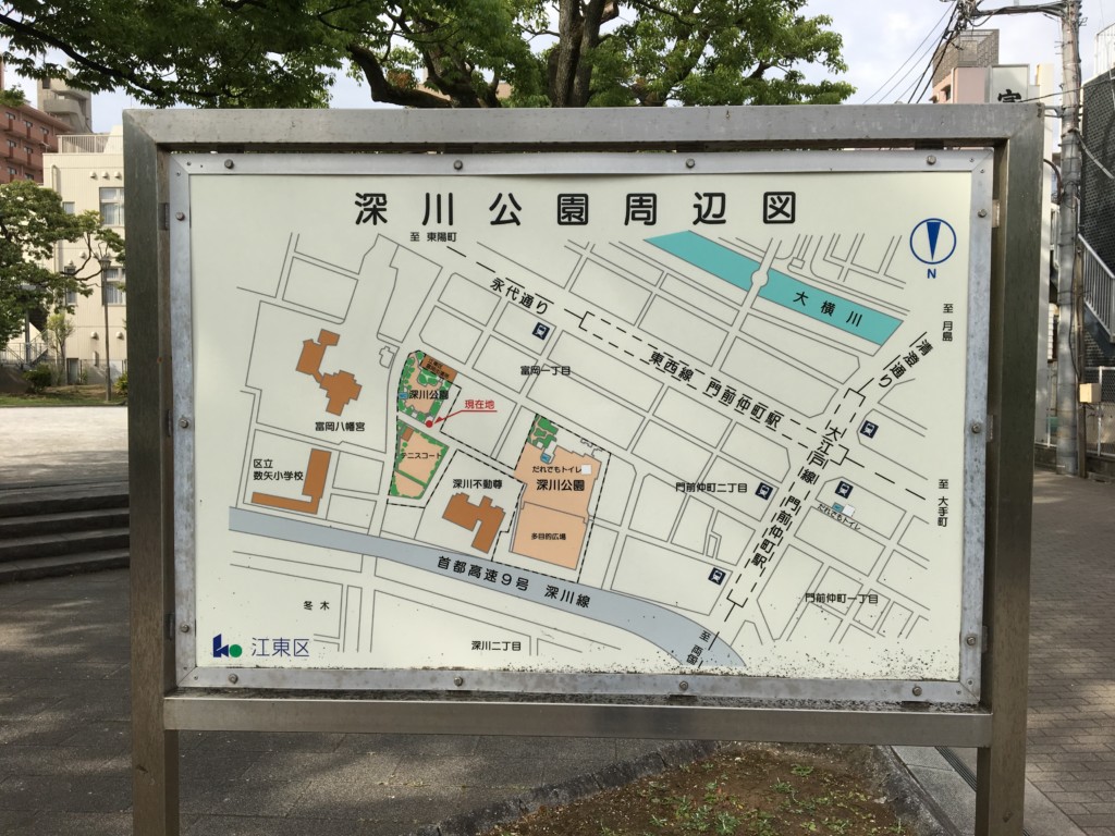 深川公園は、門前仲町駅の北側、徒歩4分ほどの場所にある大きな広場のある区立公園です。