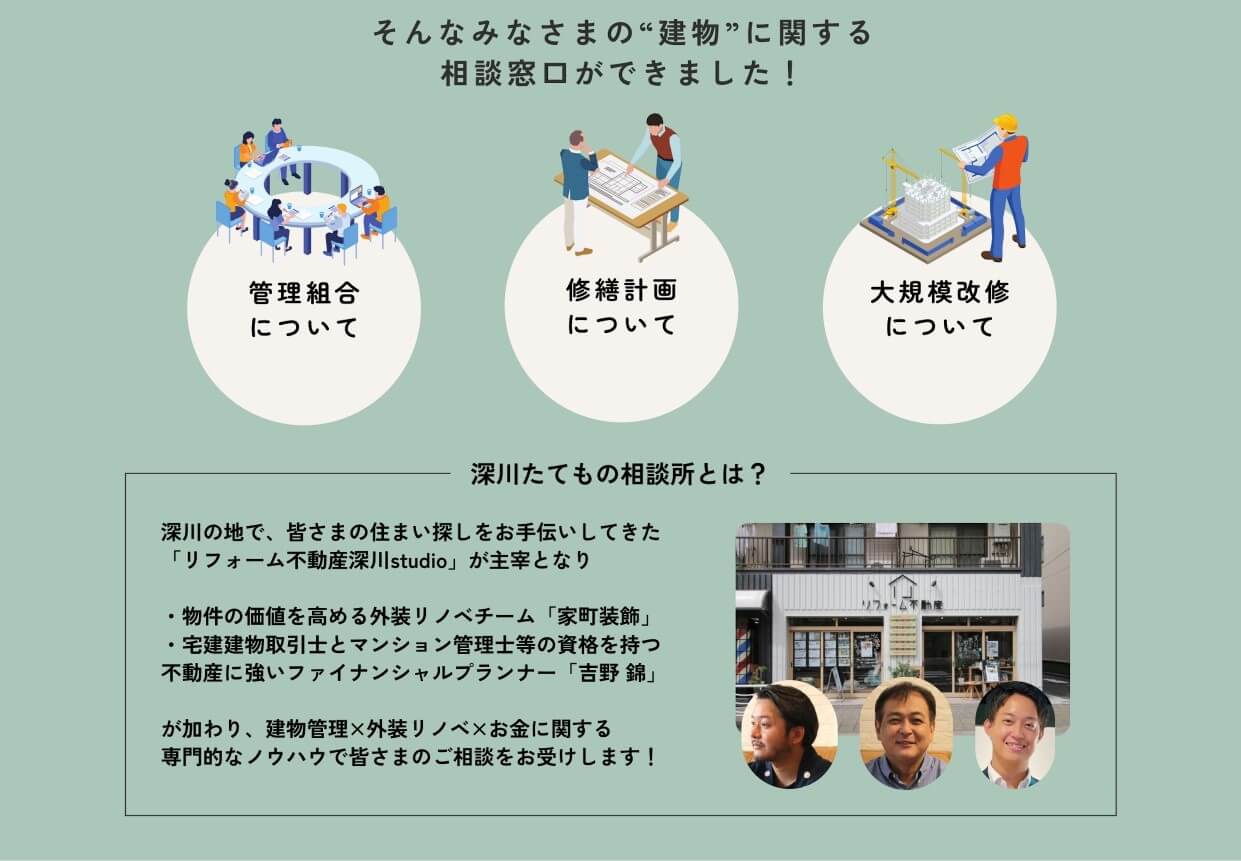Webメディア「深川くらし」を運営する株式会社トラストリーの代表・柴田が中心となり、リノベーションを得意とする株式会社リペア 執行役員の梅田、マンション管理士でファイナンシャルプランナーの吉野の3名でタッグを組み、お客様一人ひとりやマンションの管理組合のご要望にあった外装リノベーション・大規模修繕をご提案するサービス……それが「深川たてもの相談所」です。