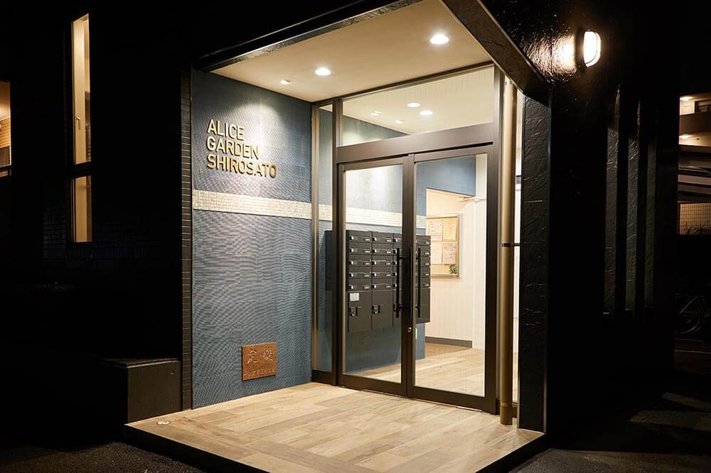 ▲写真:暗い印象のエントランスをリノベーション。現在入居している若い世代のファミリーにも親和性の高い見た目にリニューアル。同じ物件でも昼と夜とで提案するポイントも変わるため、相談をお受けする際は、夜の建物もしっかりと観察した上でデザイン提案を行う