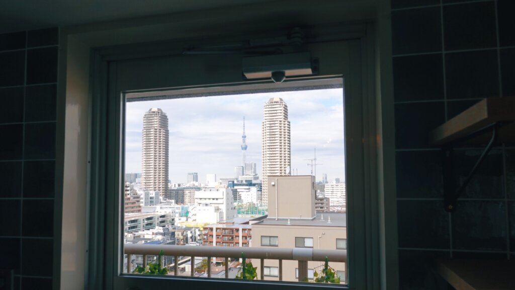 眺望は想像よりも良くて、キッチンの窓からスカイツリーが絵画のように切り取って見えるのがお気に入りです。ここからバルコニーに出られるのですが、かなり広いのでウッドデッキを敷いてみました。春になったら、ここで食事も楽しめそうです。