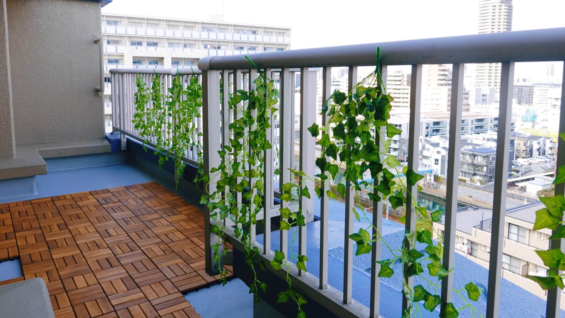 眺望は想像よりも良くて、キッチンの窓からスカイツリーが絵画のように切り取って見えるのがお気に入りです。ここからバルコニーに出られるのですが、かなり広いのでウッドデッキを敷いてみました。春になったら、ここで食事も楽しめそうです。