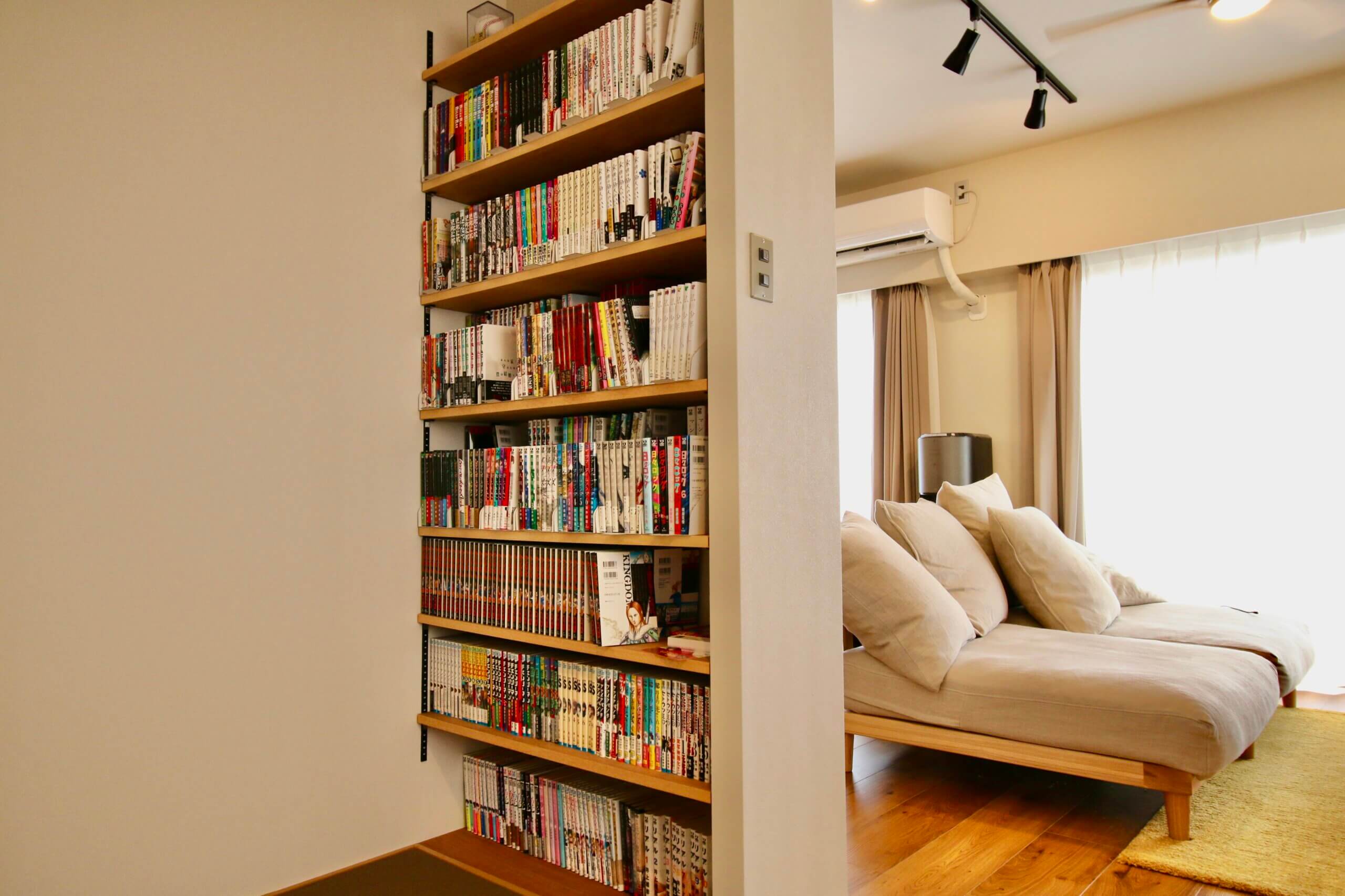 ▲リビングの横には畳のスペースを作り、壁に棚を造作しました。