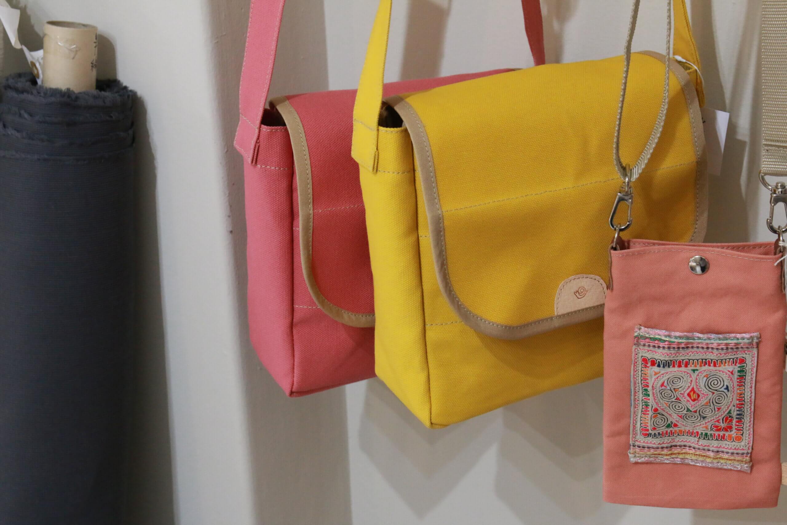 上の写真右側に吊り下がってるコロンとしたショルダーバックは「そらまめショルダー」、真ん中のかばんは「よくはいーる」とお茶目な名前がついていてそこもかわいい。