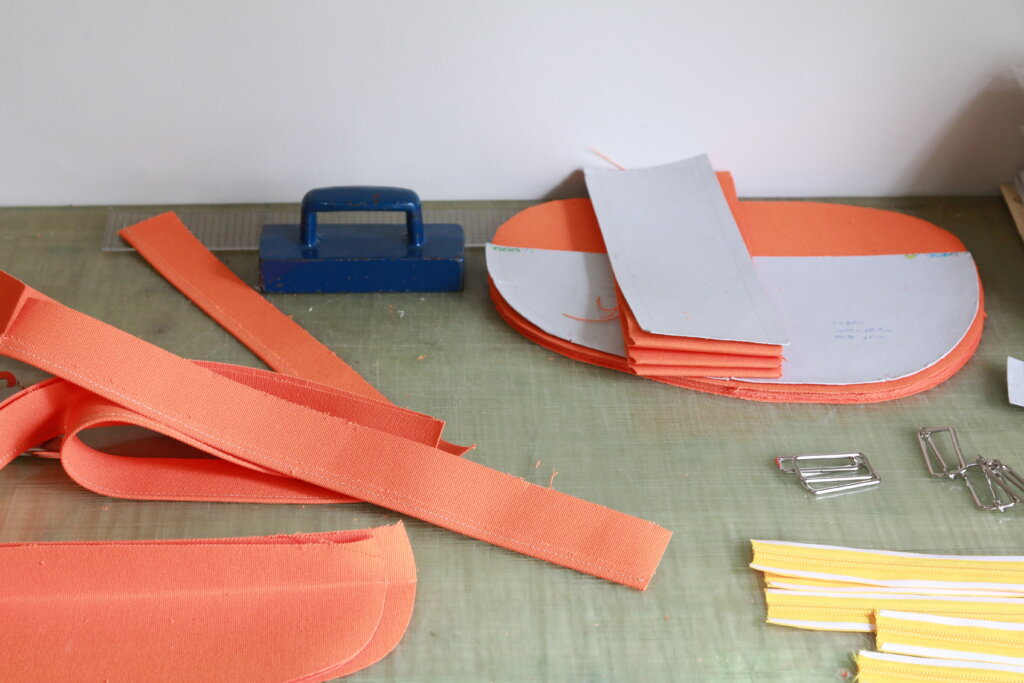 まずは型取りをして、生地を裁断。生地に折り目をつけて縫っていきます。