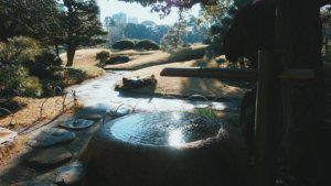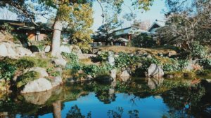 池の端に置かれた石を飛び飛びに歩くと広々とした池の眺めを楽しめるだけでなく、歩みを進めるたびに、景観が変化するよう配慮されています。また、園内には松尾芭蕉の句碑も。「古池や かはづ飛び込む 水の音」芭蕉の最も有名な句を詠みながら、池を眺めるとまた違った風景が見えてくるかもしれません。
