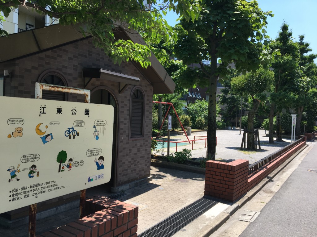 江東公園は、住吉駅を出て四ツ目通りを東陽町方面へ向かった通り沿いの扇橋2丁目にある公園です。