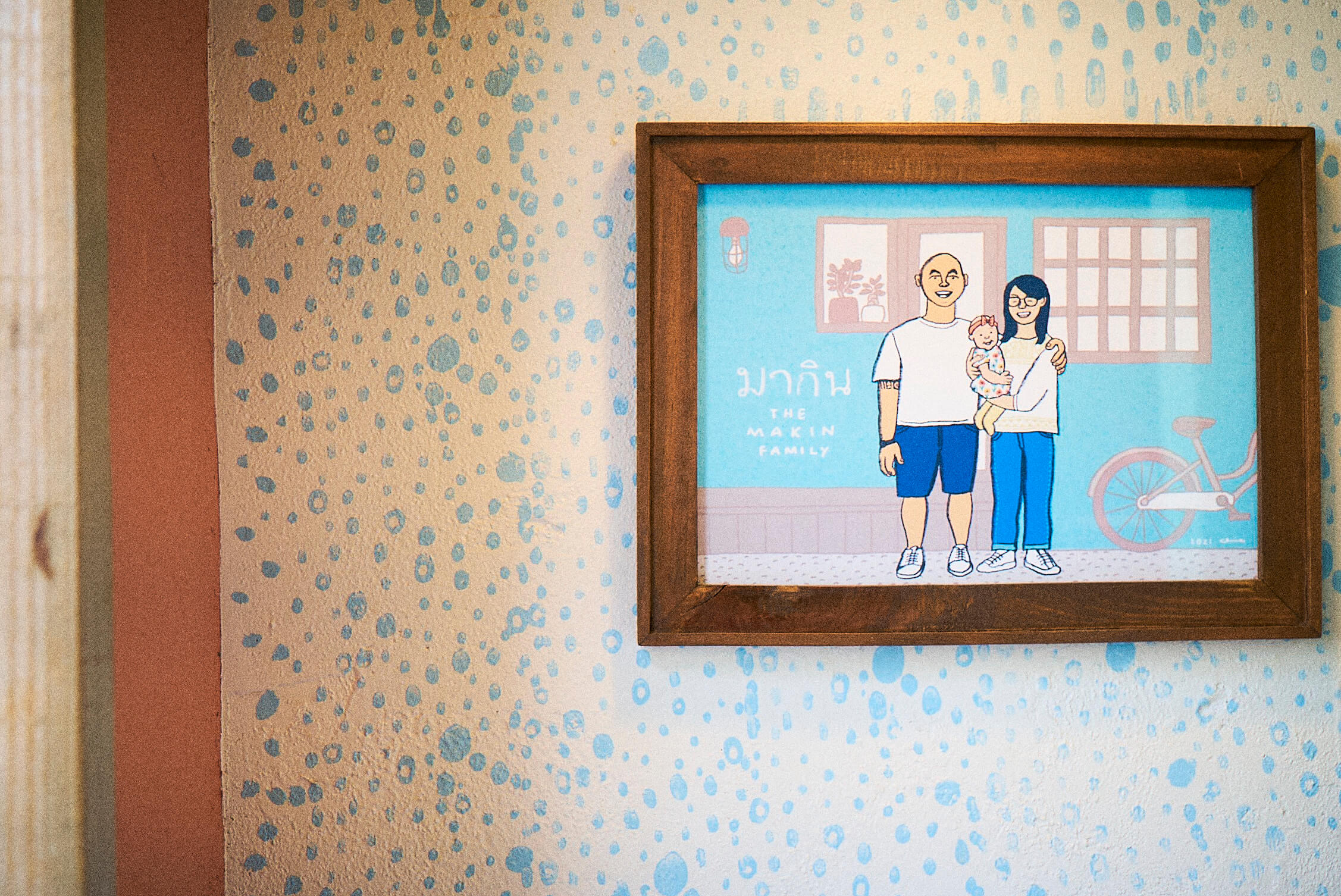 ▲左 青いパッケージのタイのジュースCHABAAも飲めます! ▲右 ご夫婦とお子さんのかわいらしいイラスト