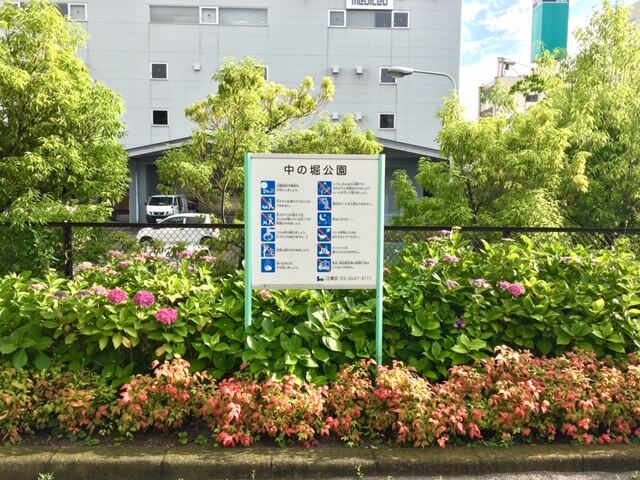 中の堀公園は、門前仲町駅の北西側、首都高速9号深川線の高架下を超えて隅田川に近い場所にある佐賀2丁目の公園です。