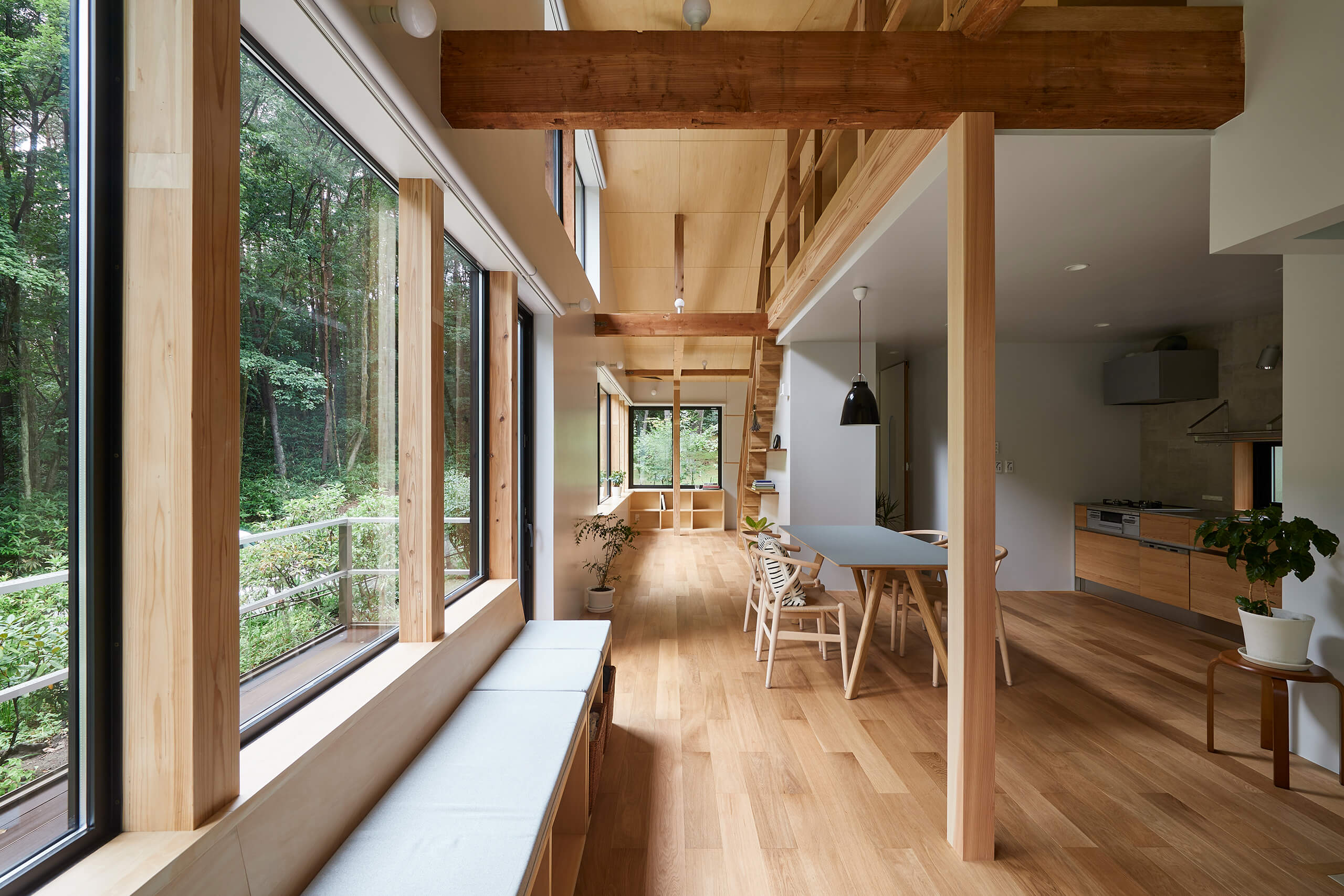 木の建材をふんだんに使用した明るく爽やかな空間。ダイニングを囲ったり、窓際に腰掛けたり、ここでの時間の流れが見えるようなデザインです。