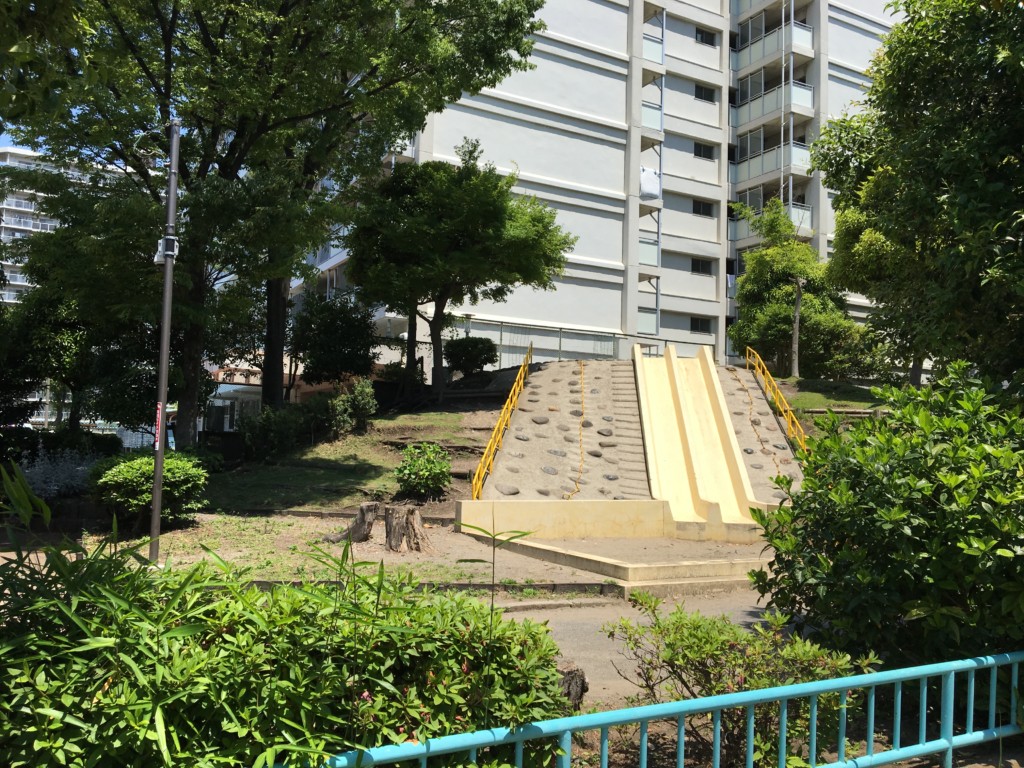 園内には小高い丘があって、そこからすべり台で下りれるようになっており、植栽もふんだんに植えられており、庭園型の公園ということができます。