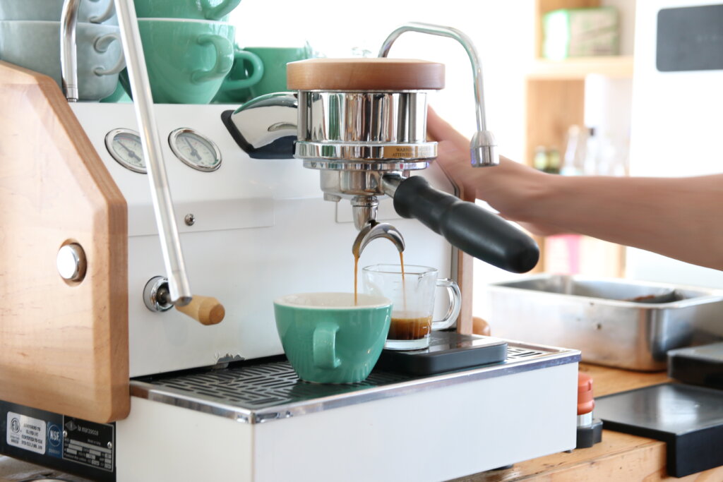 一杯ずつ豆を挽き、ぎゅっと押したらエスプレッソマシンへ。