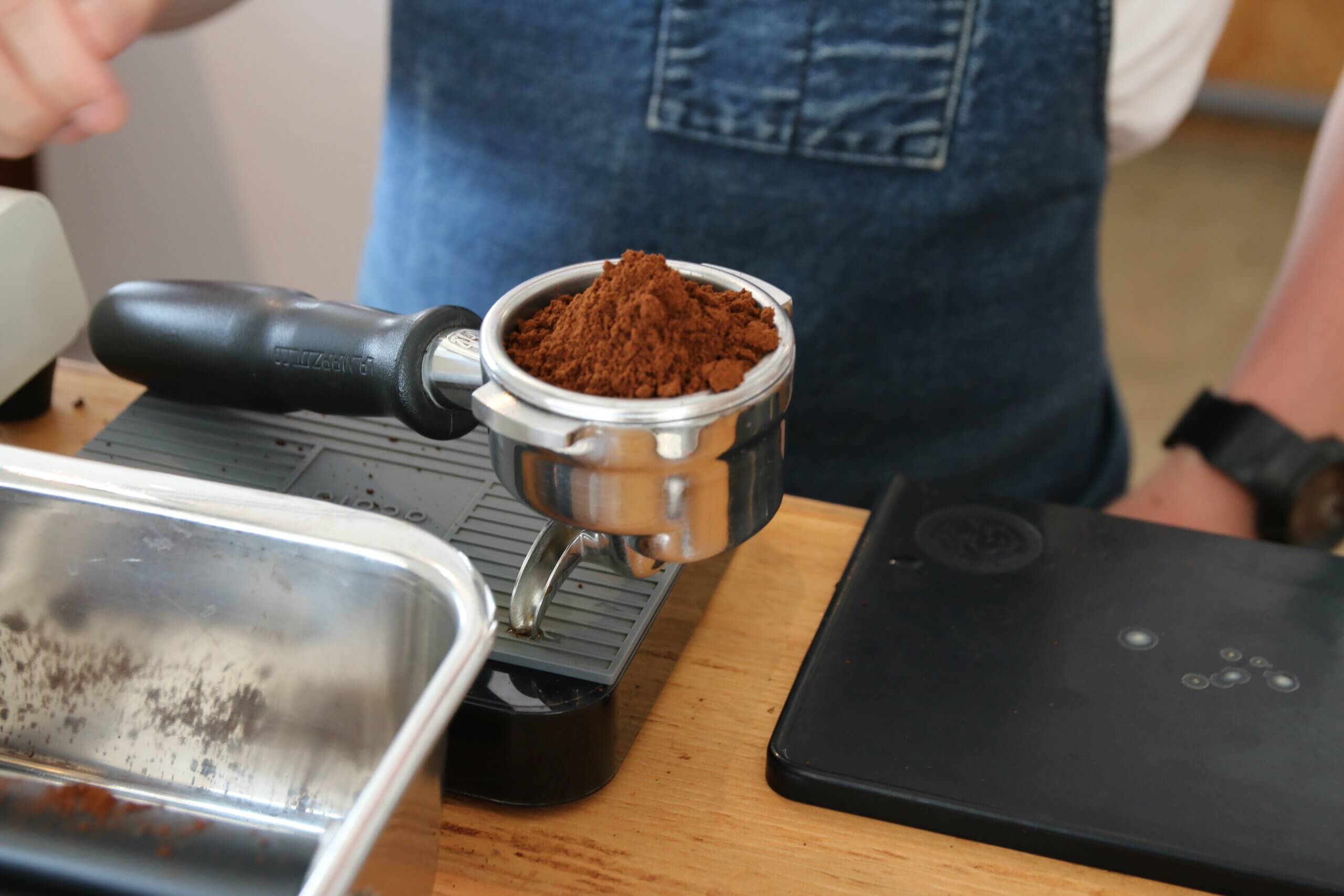 一杯ずつ豆を挽き、ぎゅっと押したらエスプレッソマシンへ。