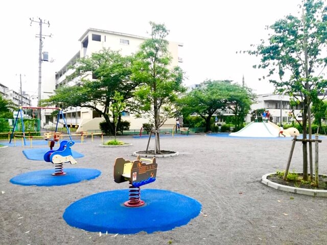 園内施設:トイレあり(オストメイト対応)、遊具(すべり台、ブランコ、スプリング)、砂場、広場