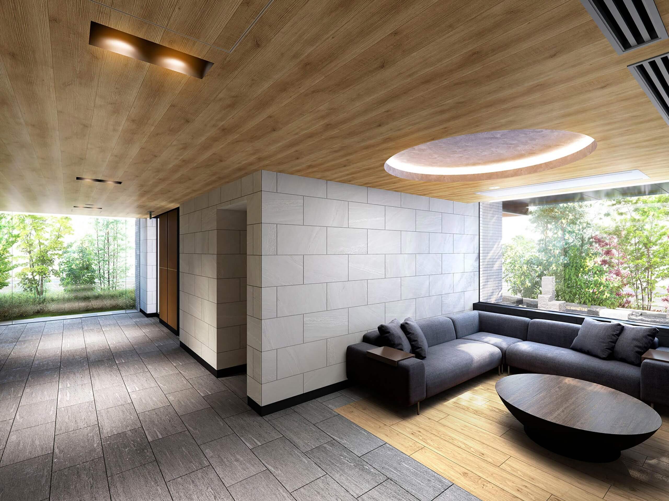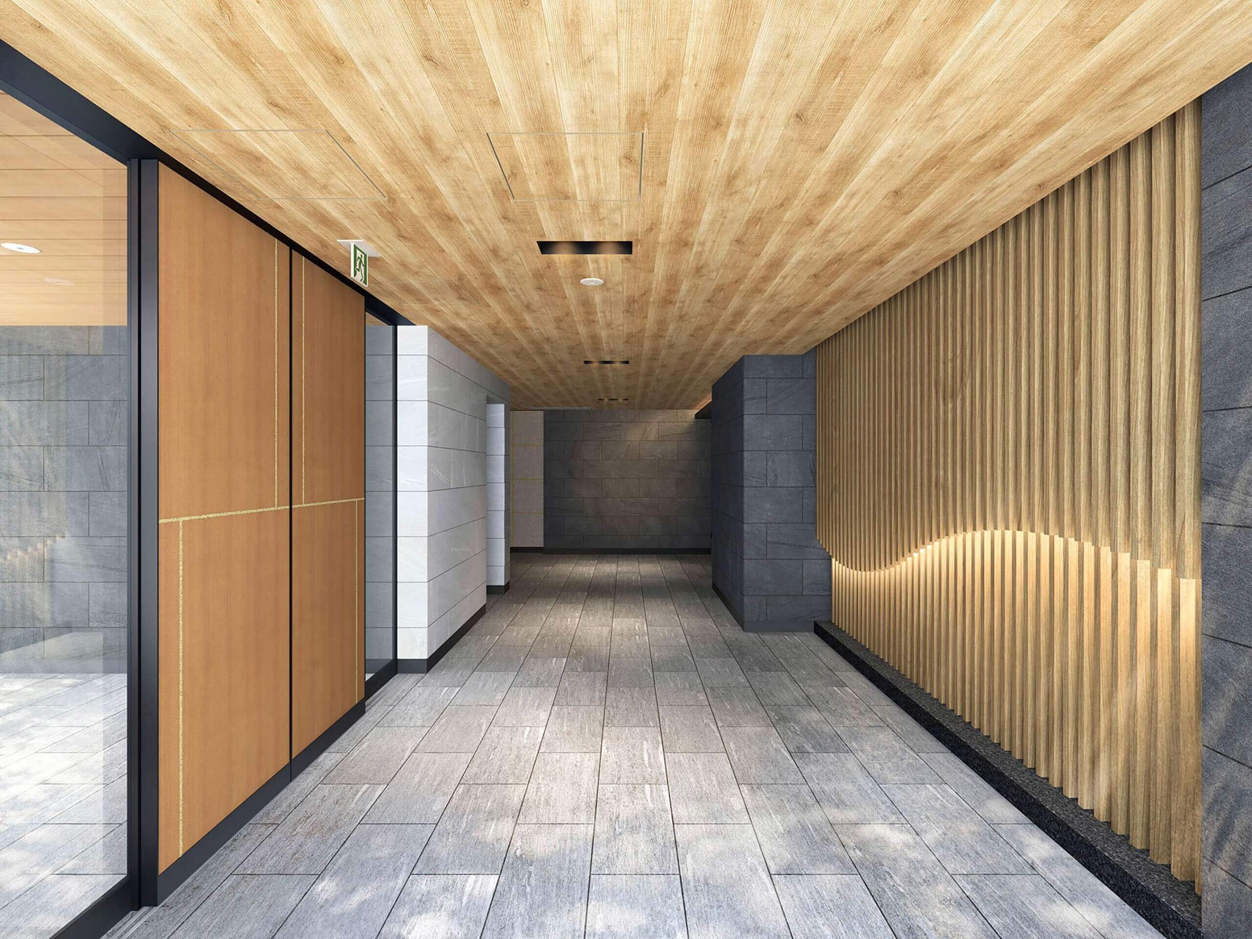 共用エントランスは門前仲町の雰囲気を感じる、石と木をメインとしたデザイン。