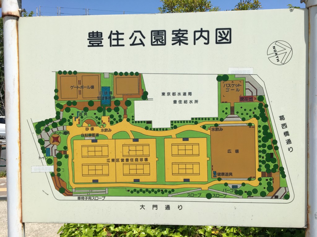 こちらの公園はスポーツする人向けに嬉しい設備となっていて、園内には、本格的な区営豊住庭球場(クラブハウス施設あり)や、ゲートボール場、バスケットゴール、アスレチックなどがあります。