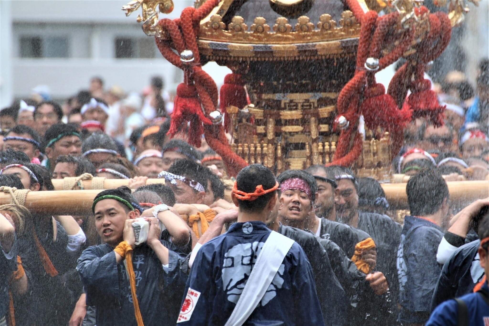 祭りのメインイベント!53基の神輿が8キロを練り歩きます。水かけ祭りなのでバケツや水鉄砲で水をばしゃばしゃと掛けます。