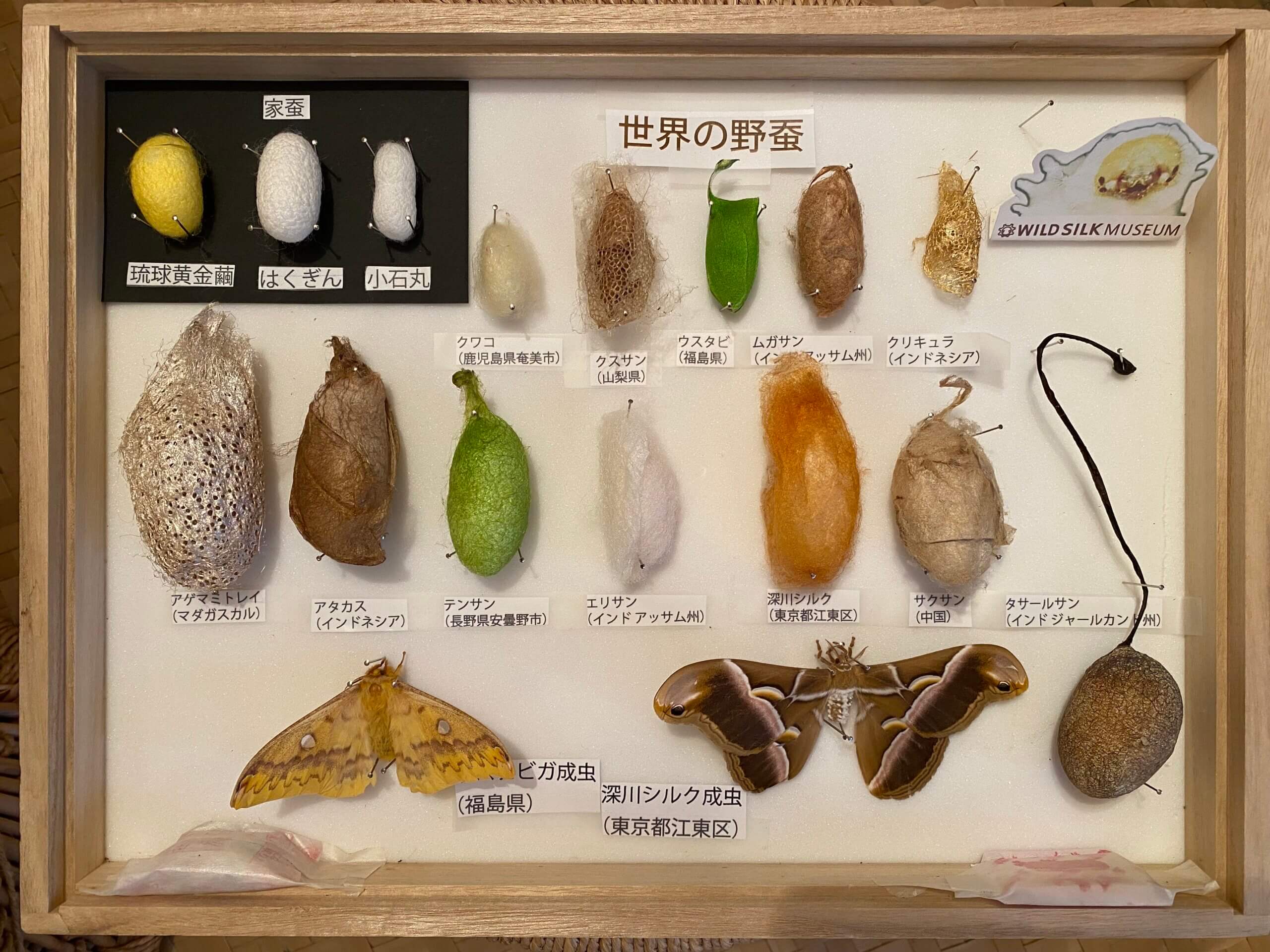 他にもさまざまな品種の蚕の繭や成虫のはく製がならび、さらには蚕のフンで作ったお茶(!?)なども試飲できる蚕尽くしのミュージアムなのです。